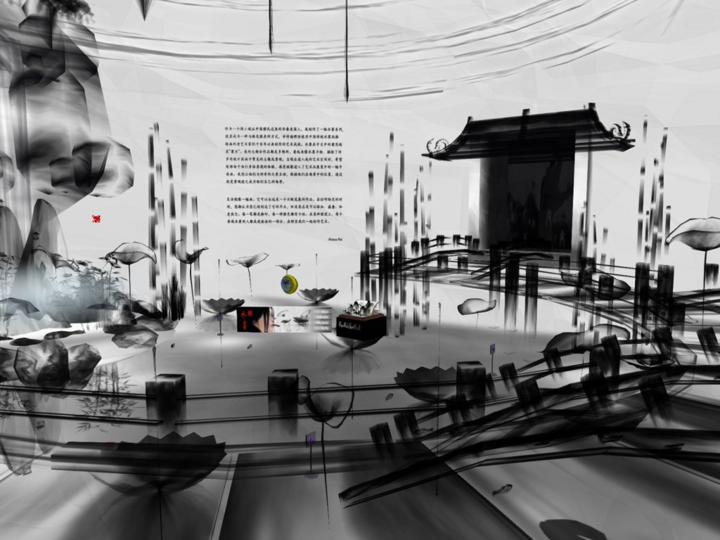Shiu Mo Gallery. Shui Mo, meaning “ink” in Chinese, is a series of living, moving installations created in the style of Chinese ink brush painting, depicting a common theme or landscape seen in many traditional Chinese paintings. keep in mind, this was all created and live/moving in a virtual world.