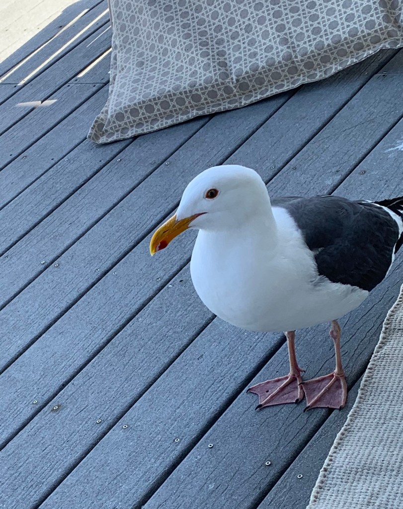 I have a seagull, Jonathan, who returns to us each year and knows me by sight. I know him because he has a small hole in his right foot. He’s no ordinary bird. He’s my bird. He never shared with me how he got that injury in all our time together though there have been many days on that deck when we sat quietly next to each other and I expected him to tell that tale. Perhaps he doesn’t want to explain it and I don’t pry.