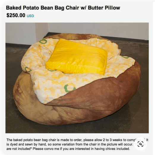 Image December 11, 2021 by FJ Somewhere out there is a woman who makes baked potato bean bag chairs and asks us to “convo” her if we also want chives. I think about this a lot. Share this:Share Share on Facebook (Opens in new window) Facebook Share on X (Opens in new window) X Like Loading... Related